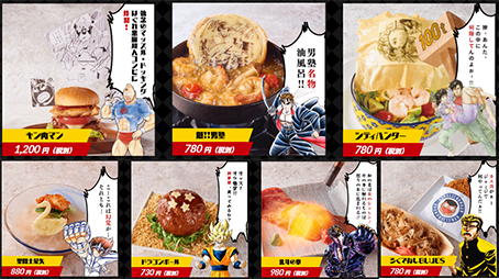 Ao todo são sete pratos especiais inspirados nos títulos: Kinnikuman, City Hunter, Rokudenashi Blues, Sakigake!! Otokojuku, Cavaleiros do Zodíaco, Dragon Ball, e Fist of the North Star (Hokuto no Ken), todos clássicos dos anos 80 e publicados na revista.