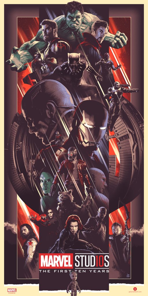 Em 2008 se iniciava o universo Marvel com o filme do Homem de ferro e daí pra frente mais e mais heróis foram aparecendo nos cinemas. Em uma década conhecemos deuses e alienígenas incríveis, cientistas egocêntricos, monstros amáveis e agentes secretos cheio de mistérios. Para comemorar esse sucesso o artista John Guydo desenvolveu dois posteres muito legais.